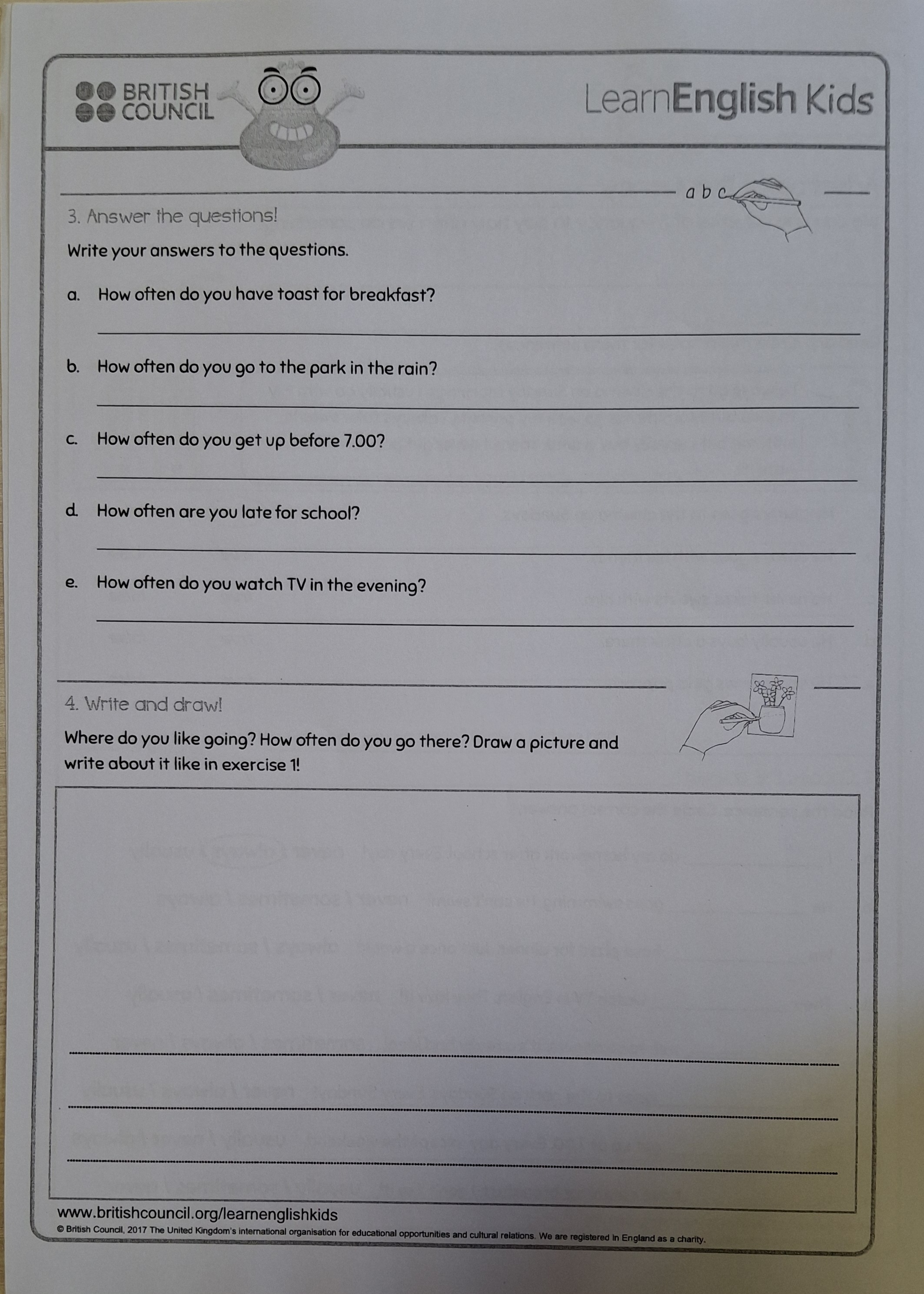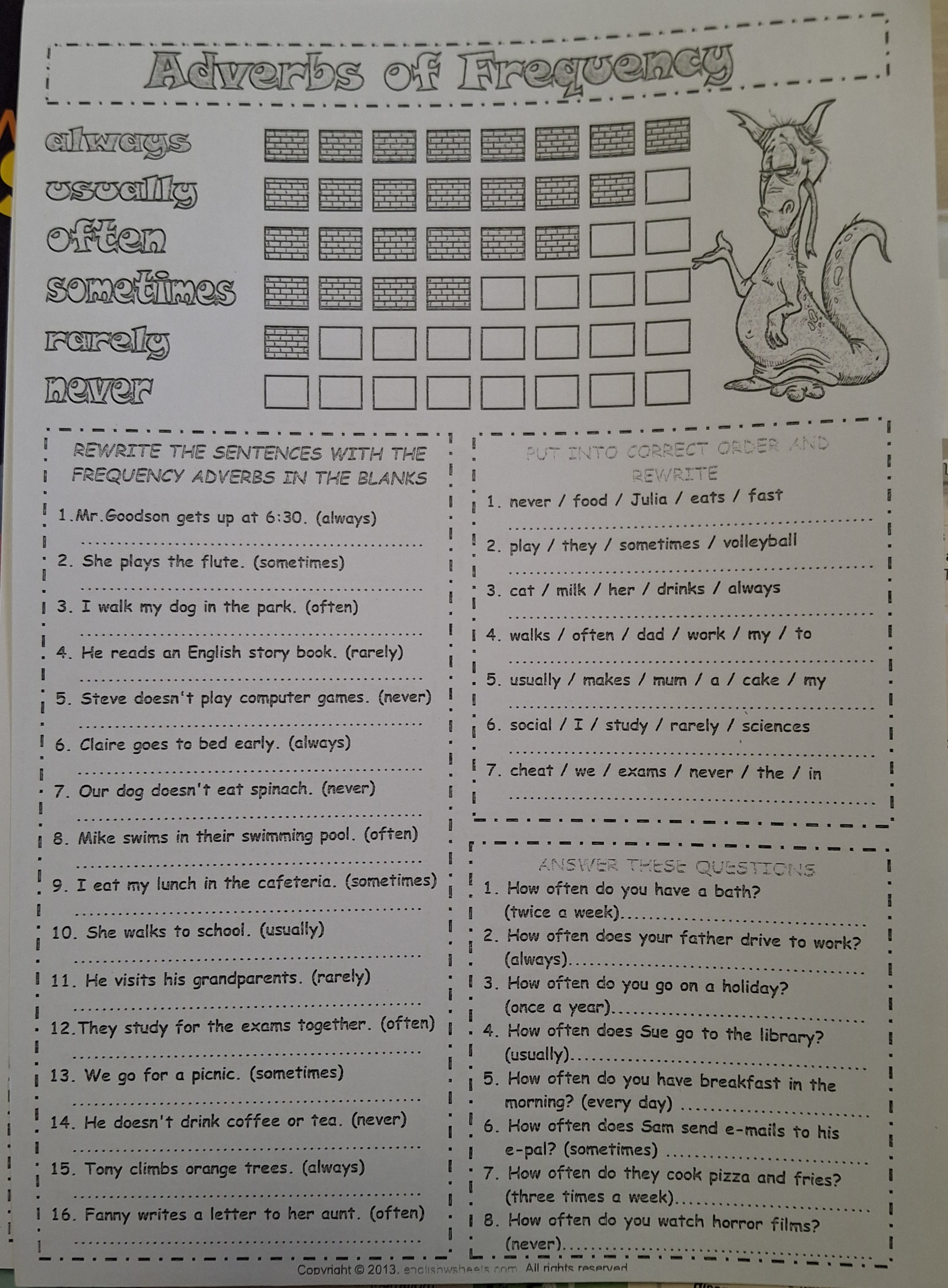 Grammar: complete excercises in Grammar Way 3 pg 9 #11 in the book and complete the handouts (click for Frequency adverbs) (click for Adverbs of frequency homework page 1) (click for Adverbs of frequency homework page 2)